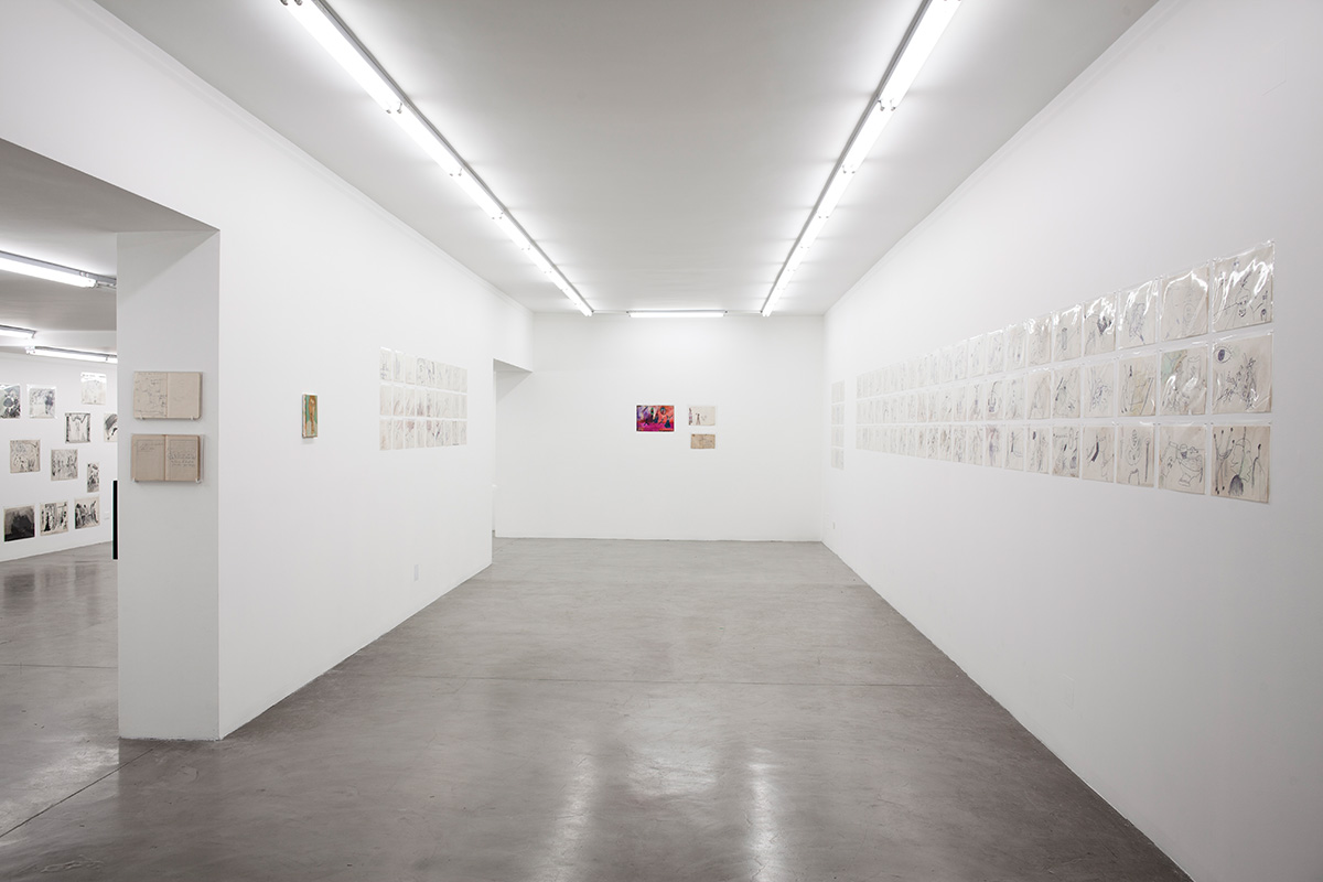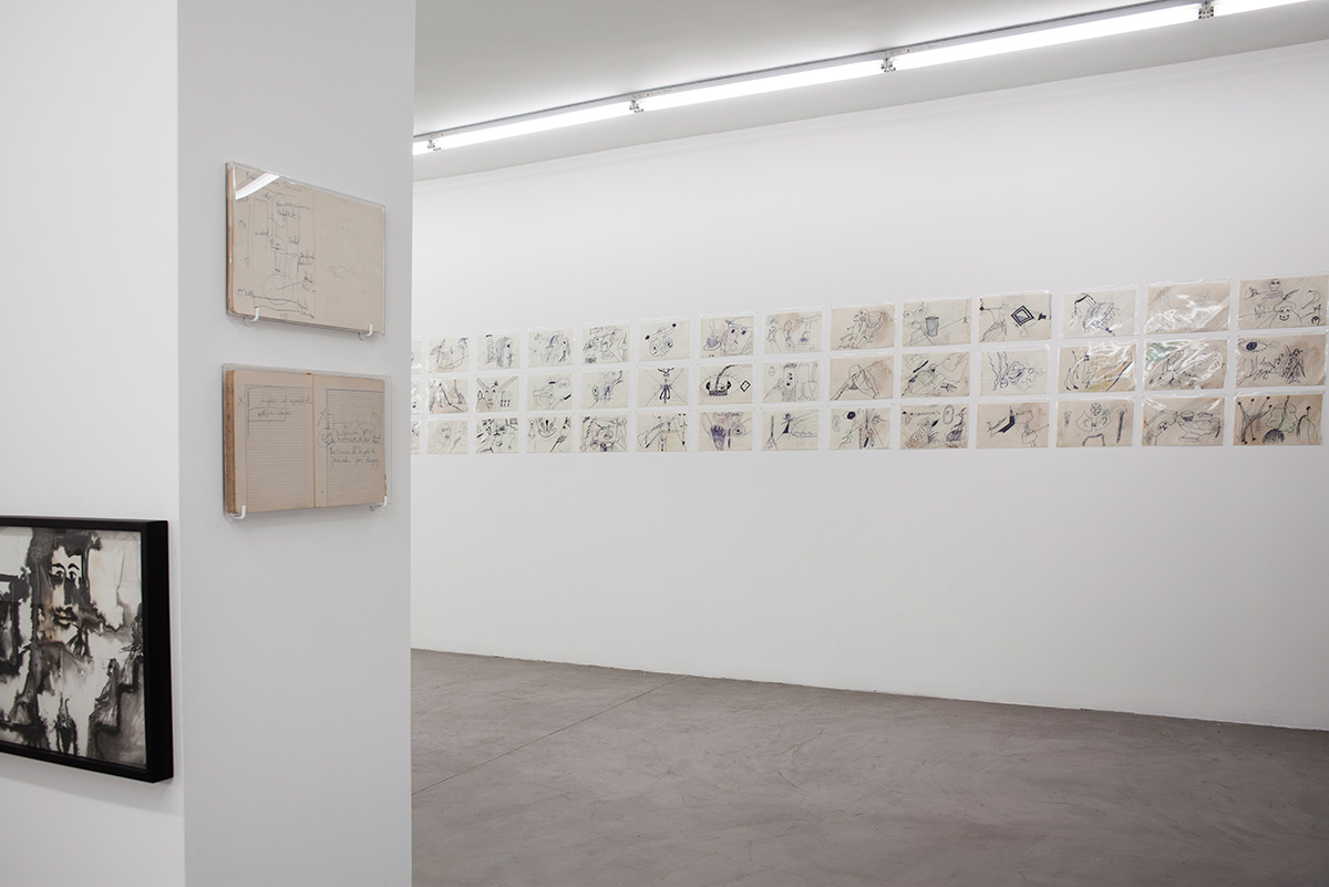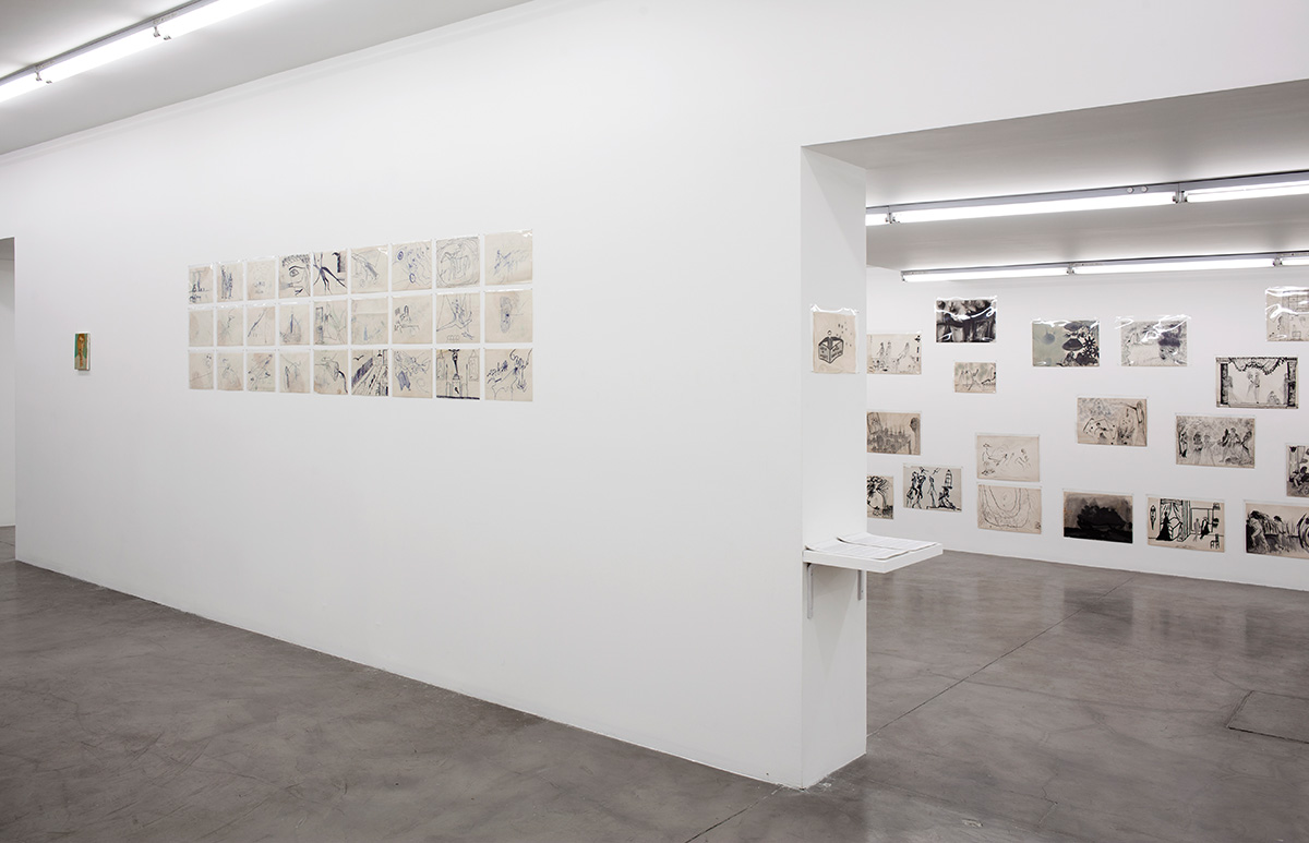 This is the first time that these papers, which managed not to perish in the artist’s studio, are on exhibit in a gallery. The passage of time has not been without consequence; the most unlikely transferences between the images and opportune aging process have occurred over these forty-plus years. They are in felt marker, spray works on paper, pen, or pencil; few of these drawings contain color. Many were rendered on the surfaces he used as an architecture student, others on bureaucratic and repetitive office stationary. There is none of his painting’s meditation or planning here. These drawings are not the key to understanding the artist’s later production, and that is why they require special attention.