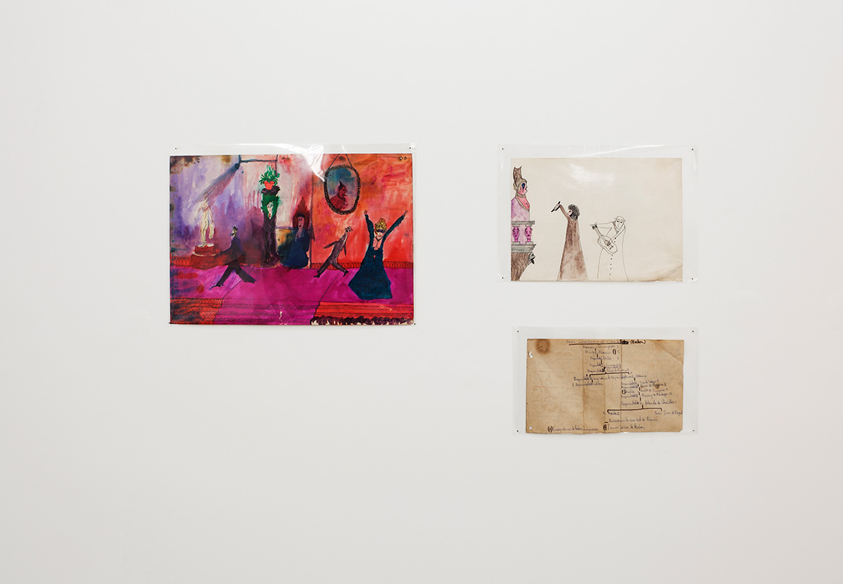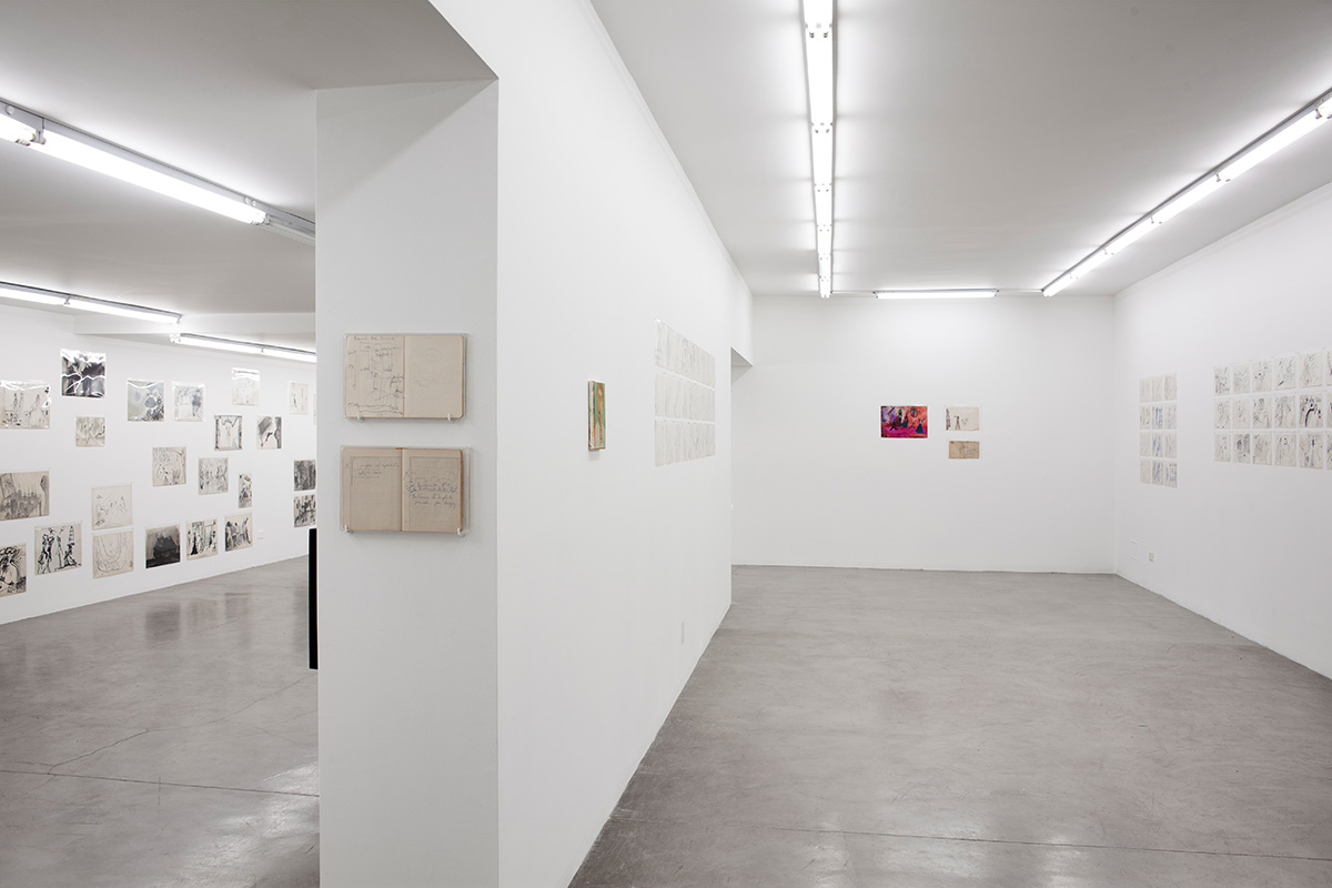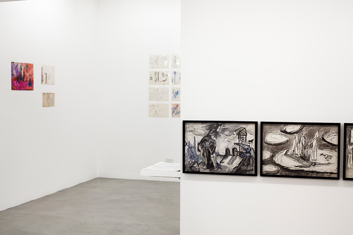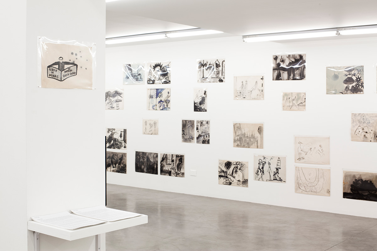 Amidst the papers, catalogues, and notebooks belonging to Santiago García Sáenz and kept by artist José Garófalo in his studio, a document describing the different hours of the day in relation to prayer, something like a wikipedia entry, appeared. The term “the minor hours” names religious prayers performed between sunrise and 3PM. During those hours, the monk need not go to church, but can stop what he is doing and engage in prayer wherever he may find himself; the level of concentration required during “the major hours,” when presence in the house of worship is mandatory, is not the same. The drawings in this exhibition can be conceived as a parallel to that moment of prayer. Produced when the artist was between the ages of nineteen and twenty-seven, the drawings are either depictions of scenes from the Middle Ages—either of torture performed during the Inquisition or of palace life—or clumsy registers of daily life with surrealist spirit.