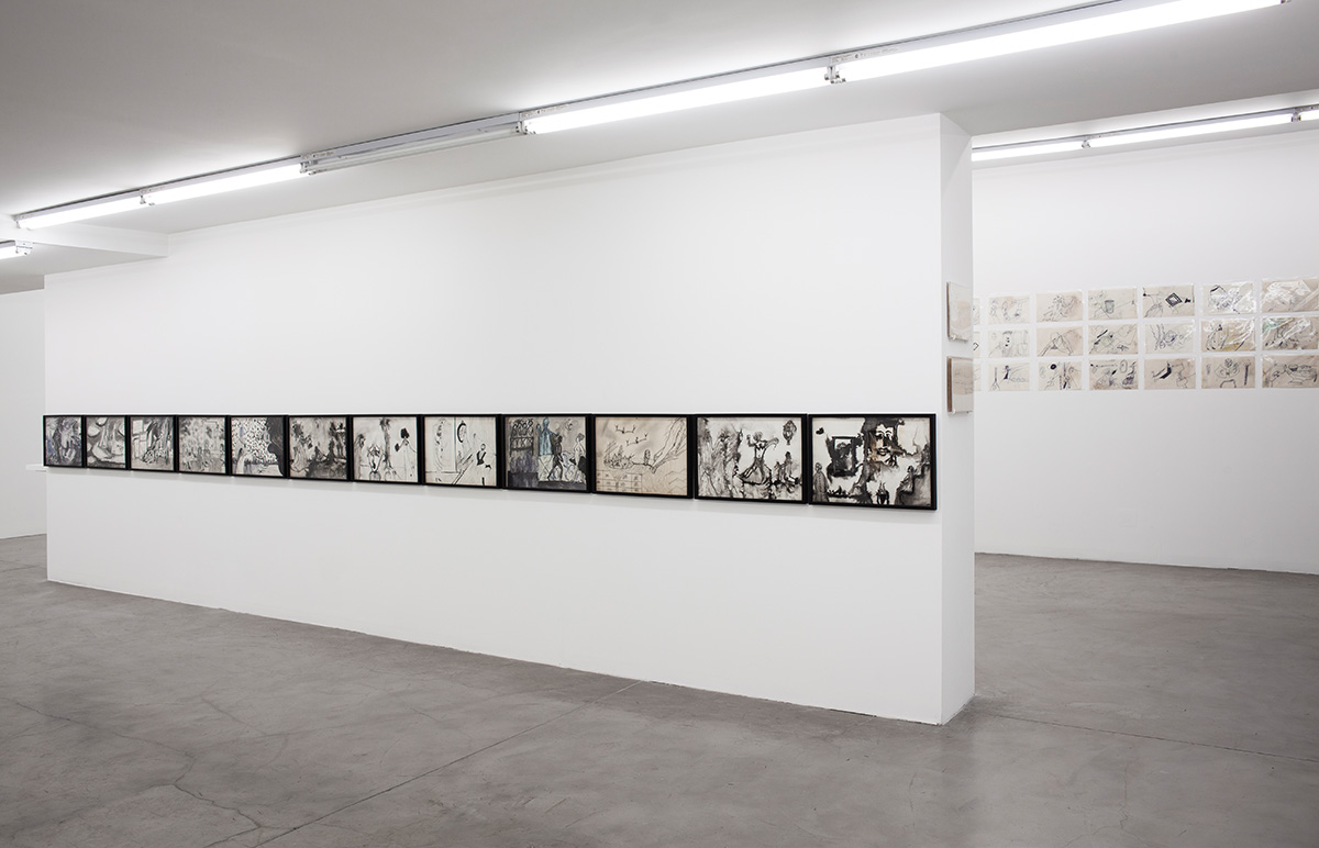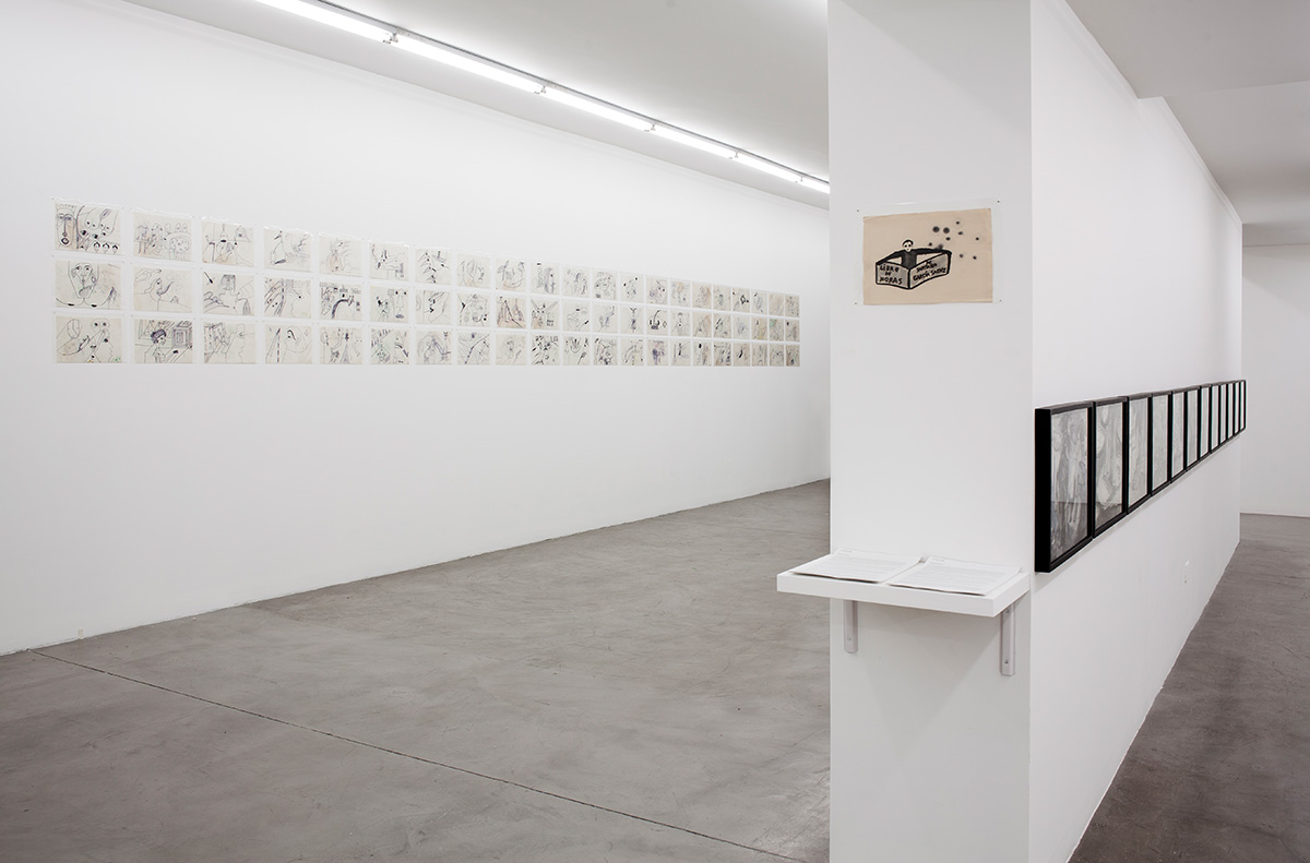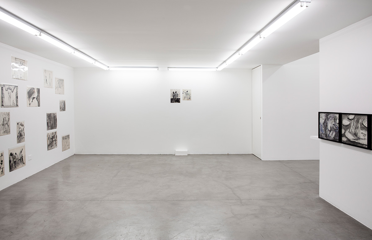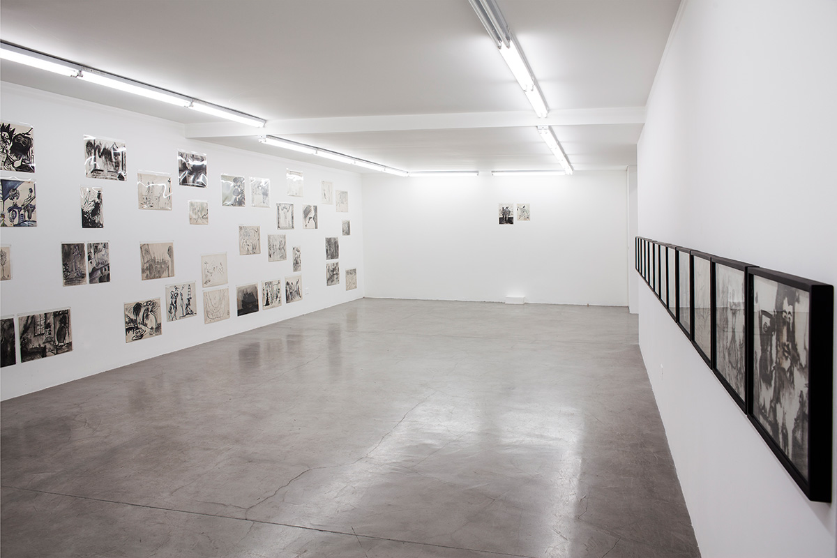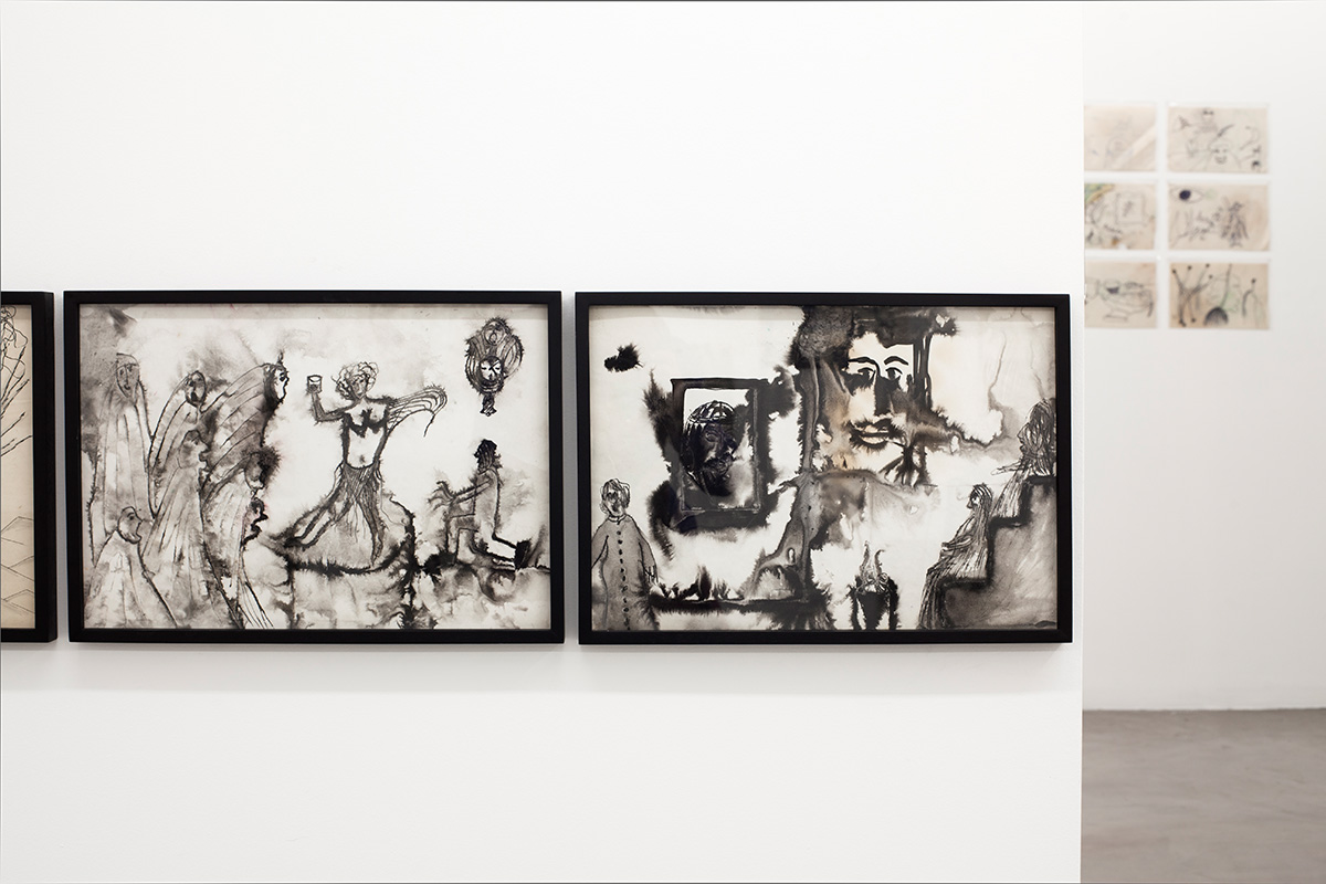 These works on paper are not sketches. Though they aim for immediate release, they are bound to micro-stories that tend to cluster regardless of temporal distance and difference in image. What binds them is a youthful sense of justice. With thin line, SGS constructs elongated characters, women walking dogs, dancers with exaggerated curves, but also a shapeless figure pissing on paintings or a dead man rising. The ways of envisioning the set, of activating its images, range from the most obvious and biased to the most personal and biographical: