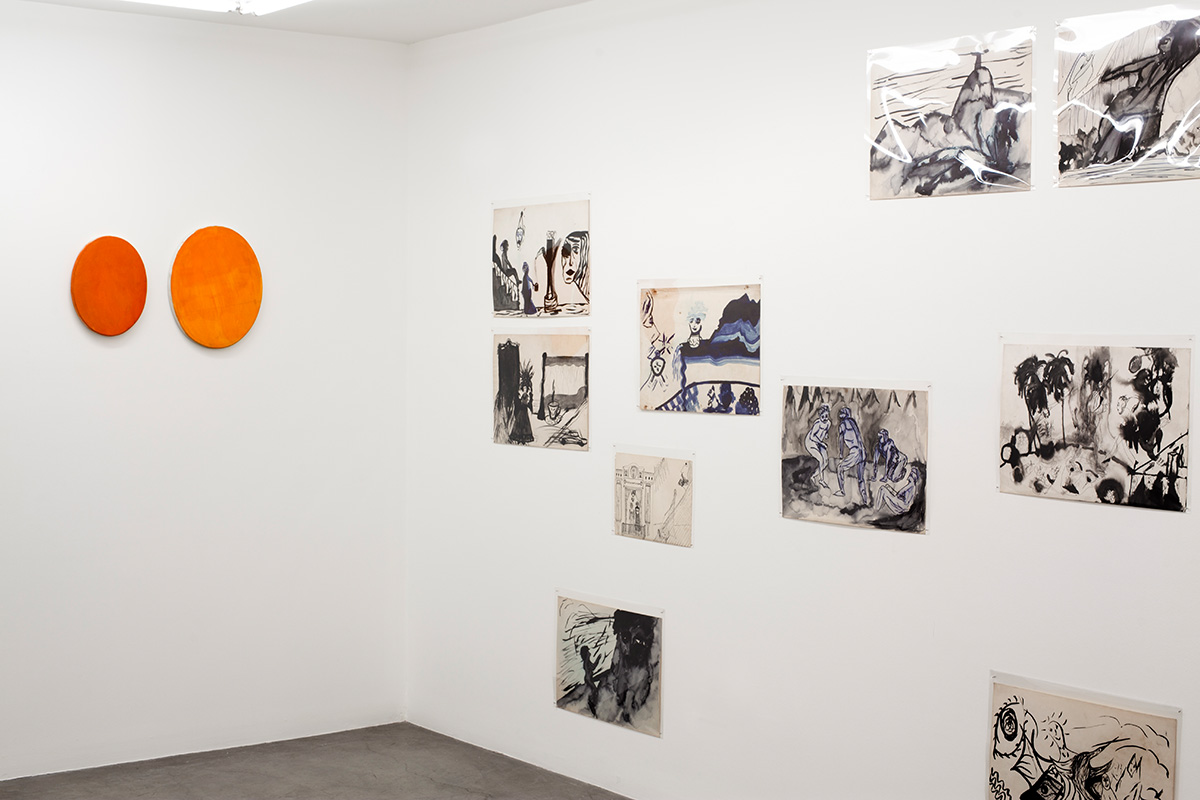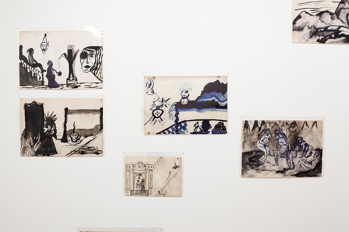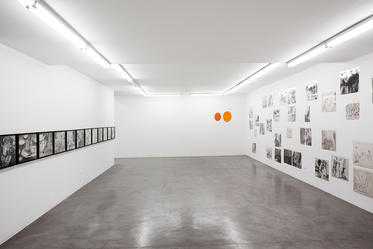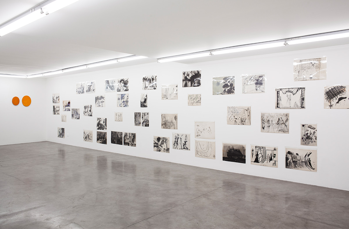 These works on paper are not sketches. Though they aim for immediate release, they are bound to micro-stories that tend to cluster regardless of temporal distance and difference in image. What binds them is a youthful sense of justice. With thin line, SGS constructs elongated characters, women walking dogs, dancers with exaggerated curves, but also a shapeless figure pissing on paintings or a dead man rising. The ways of envisioning the set, of activating its images, range from the most obvious and biased to the most personal and biographical: