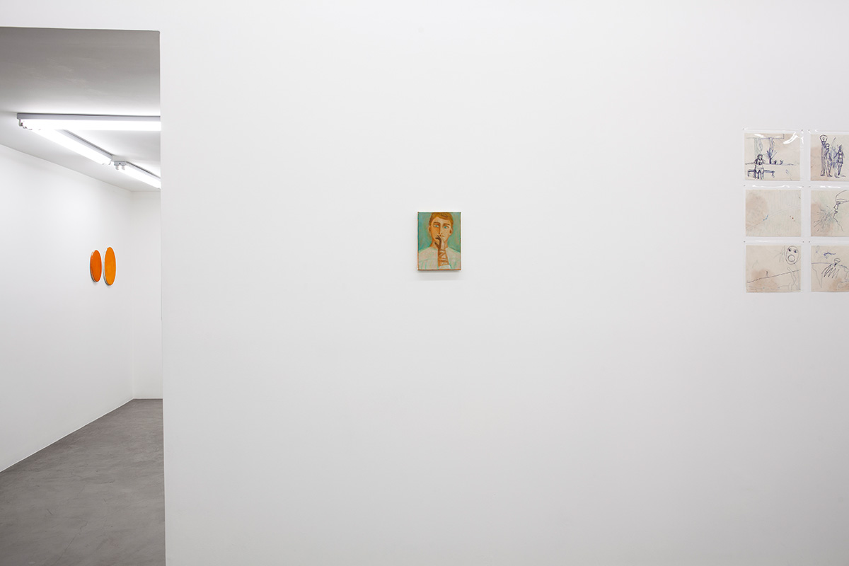 Two orange surfaces—two canvases prepared for paintings that were never produced—stand out from the series. That orange that, it would appear, is nowhere to be seen in most of his production is the first layer of the artist’s paintings. It is an orange that would alter each of the colors he used and the basis for future decisions that, coupled with the drawings, build a spectrum of aspirations. The small portrait with similar background conveys a desire for silence as the gallery—like a hospital or a church—is, thanks to that unfinished painting, rife with future sentiments.