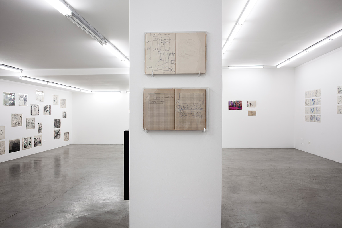 SGS quickly sketched out his paintings in two notebooks. Dividing the page into very basic planes, he would write with loose hand in ballpoint pen the words “sky,” “city”, “learing,” “Resurrection,” “Rafael,” “thecrucified floating,” “descent,” “dark,” “people walking.” It is a sketch of a painting for the Sacred Art Biennale made with the urgency of one who knows that the final image strays widely from the initial design. These are notebooks full of the markings of someone certain of what he is doing, where doubt resides in the finished painting rather than in the brushstroke underway. The notebooks are both hints to understand how he planned his works and a threshold where his painting and these early drawings are joined. There is a premeditated and often baroque decision in the lines of the paintings whereas the notes in the notebooks are looser and sloppier. But both are gripped by the same fixation on a story.