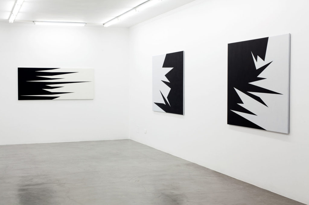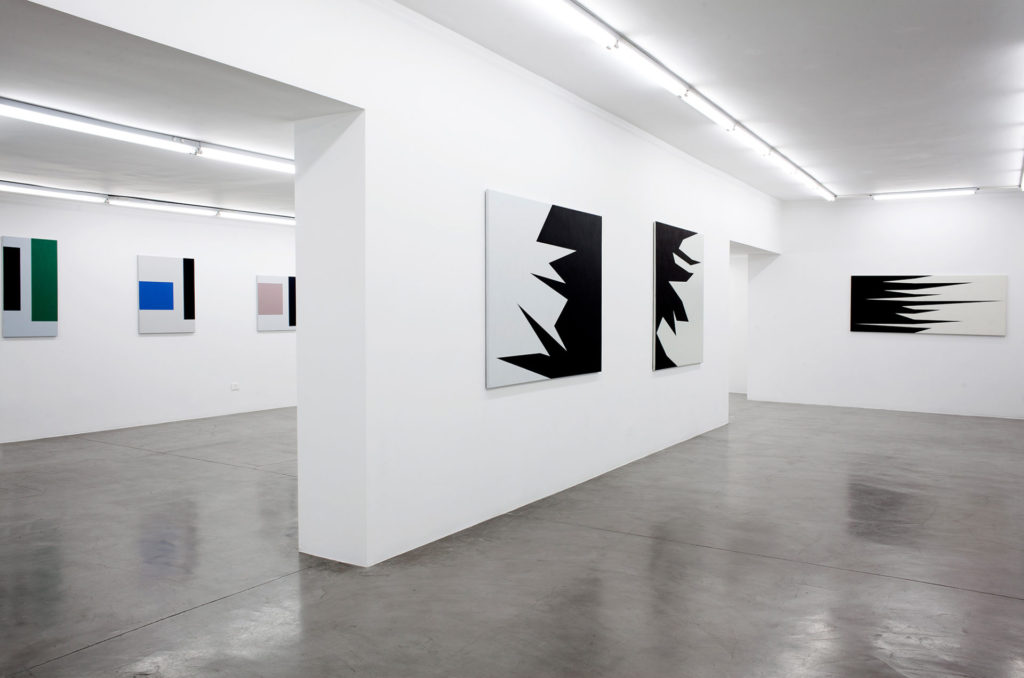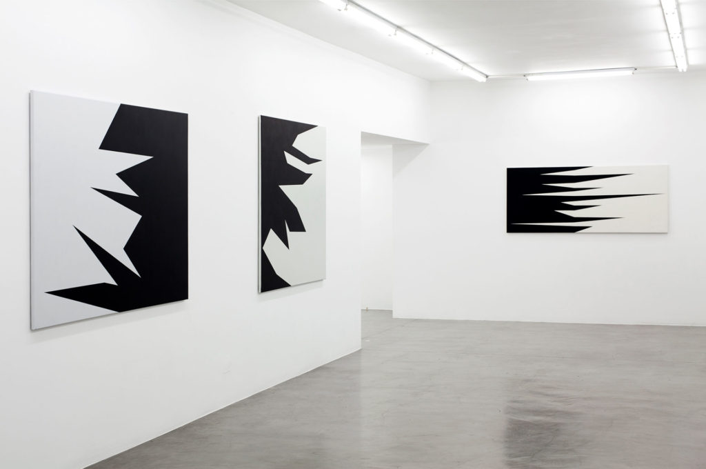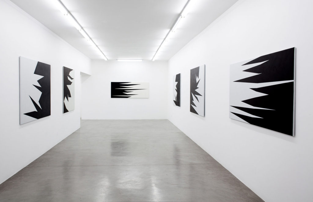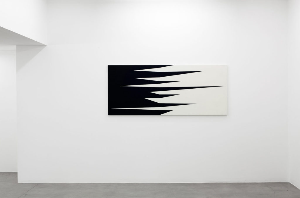 In Gilda’s art, these problems return like ghostly whispers; these debates resurface in her paintings. The figurebackground reading is the central concern of the works in this exhibition. Sharp, evasive, oblique, they confront us with a precise problem: Is the black surface the figure? Is the white plane the background? Or is it the other way around? Not one or the other. These are forms in tension, striving not to become background or figure, but for both to stay “up front,” affirming surface and negating any possible three-dimensional reading. These paintings once again alight on that delicate spot of pictorial composition to challenge it anew and to propose a specific solution. Fierce forms shatter the canvas as object. The irregular shapes of the cut-out frames are nowhere to be found here; the canvas, formerly malleable, is now, it seems, rigid and brittle surface.
