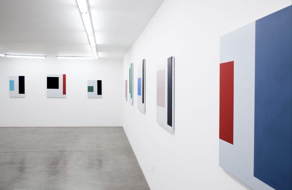 Canvas: smooth primed fabric then two coats of oil paint followed by layers of color with sanding in between. The color comes from a whole that is not seen at first, but vibrates in the layers.