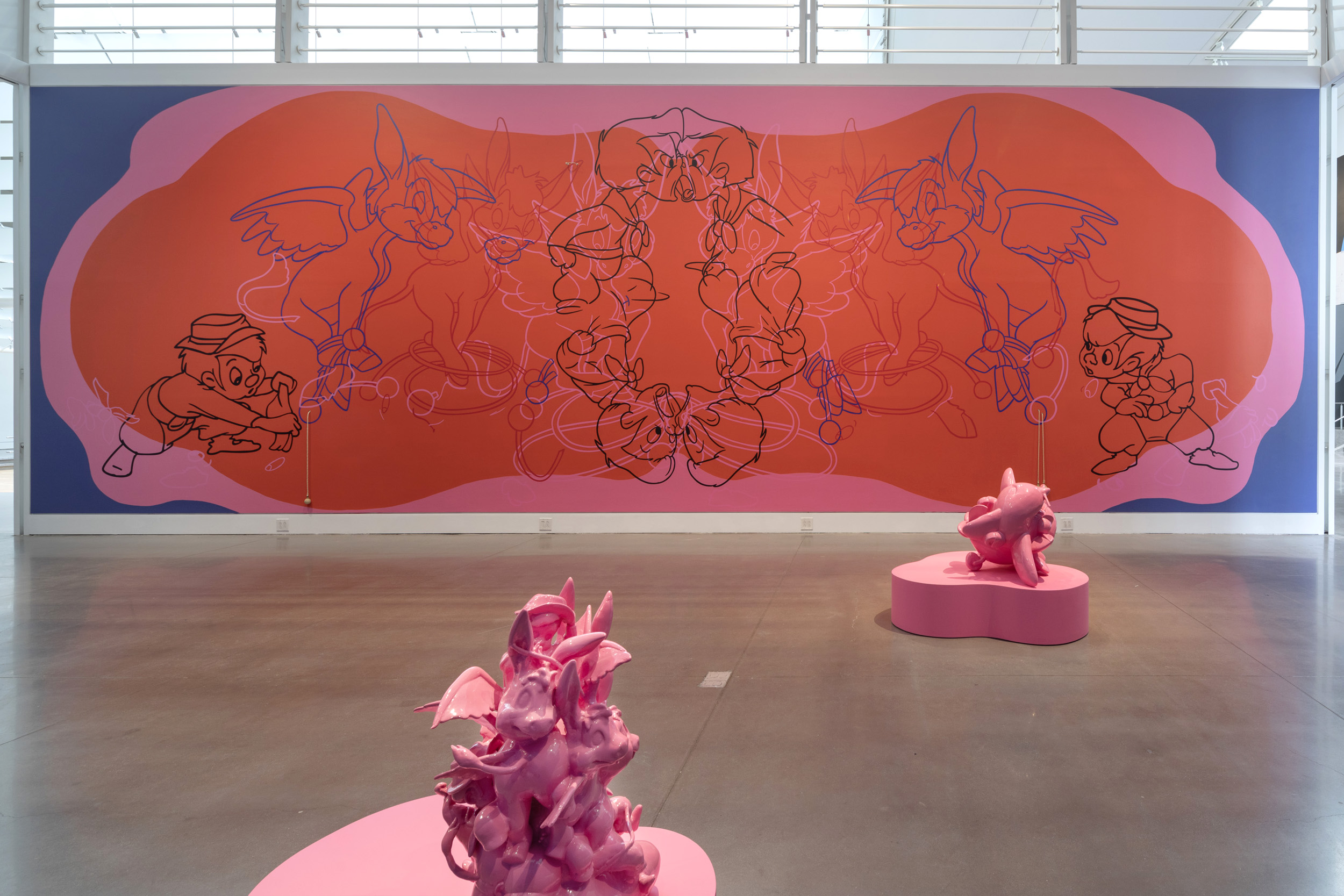 Schliebener Muñoz examina cómo estas películas funcionaron como una forma de poder suave, enlistando los medios infantiles hacia los intereses económicos y geopolíticos de Estados Unidos. A través de la instalación, el collage, la escultura y murales de gran formato, le artista subvierte las representaciones reductivas y exotizadas de las culturas latinoamericanas en las películas para centrarse en sus personajes secundarios y rebeldes desvalidos. Schliebener Muñoz también se enfrenta a las representaciones que hace Disney del género, la sexualidad, la raza y la indigenidad apropiándose y fragmentando la imaginería de las películas para crear narrativas críticas de resistencia. Reconociendo la capacidad de las historias para moldear los sistemas de valores, esta exposición emplea operaciones de reflejo, codificación queer, ambigüedad y humor para desafiar los límites impuestos entre lo real y lo ficticio, lo natural y lo sintético, lo espectacular y lo grotesco.