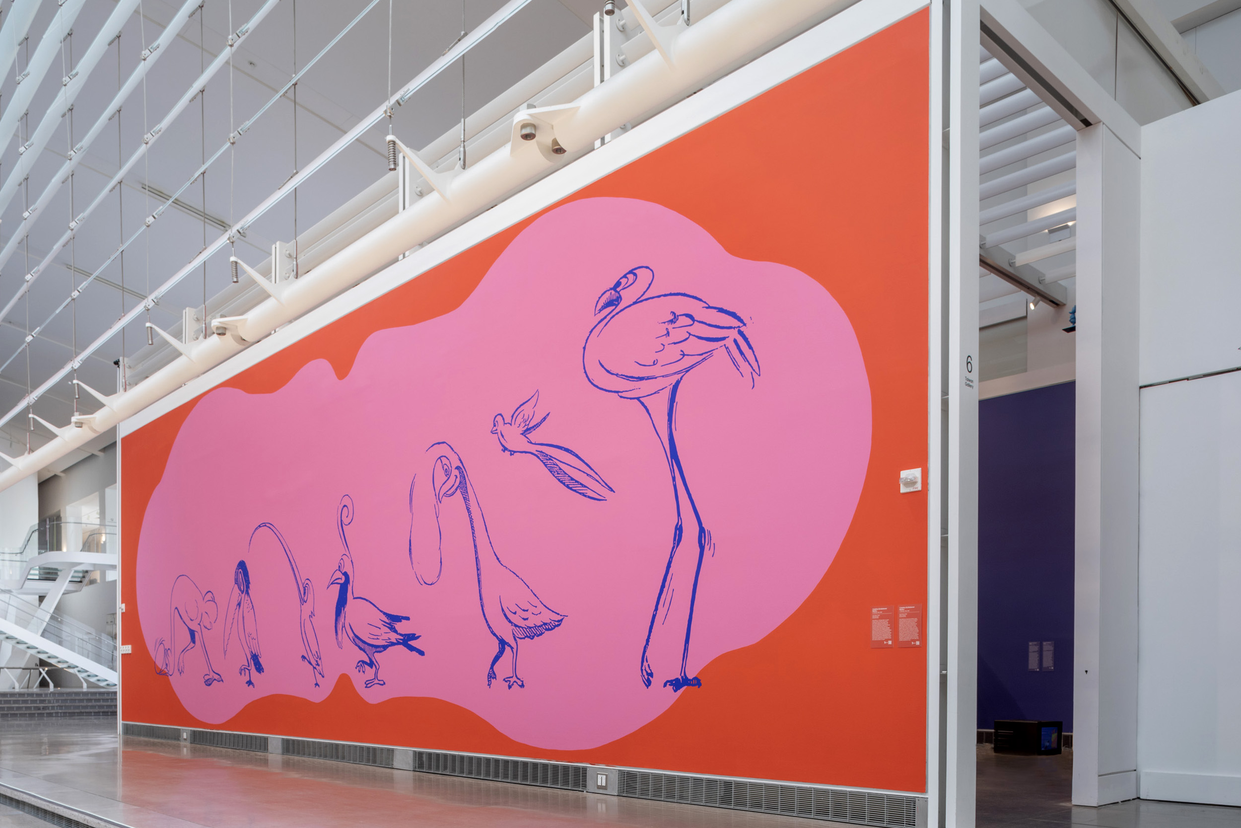 Vinilo de corte, pintura acrílica y boleadoras sobre muro