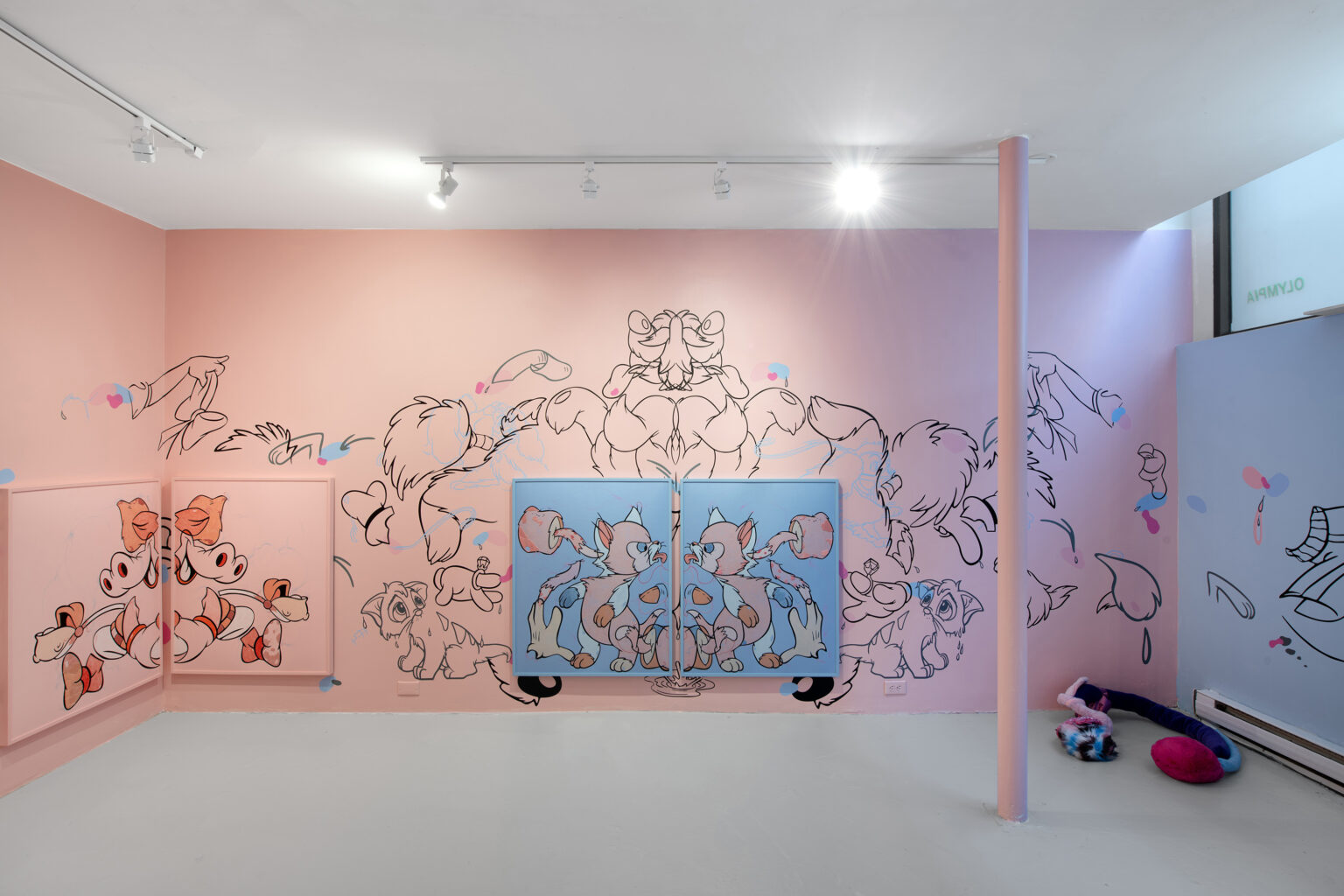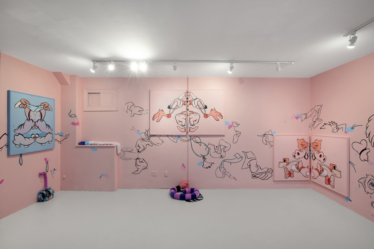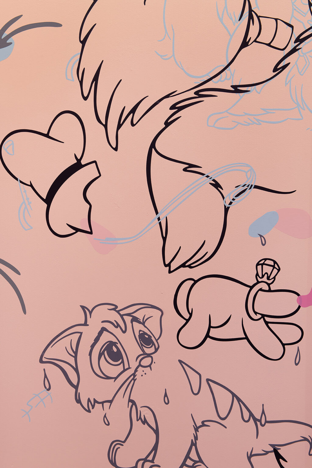 En Coloring Book , tres dípticos palindrómicos de personajes secundarios deconstruidos de Disney (Minnie, Clarabelle Cow y Figaro) junto a una única obra centrada en Goofy, anclan el mural con recortes de vinilo esparcidos por su superficie, cayendo en dos tonos superpuestos. Los vinilos utilizados en el mural están hechos de materiales reutilizados producidos originalmente en Argentina para una muestra inspirada en la instalación Once Upon A Time de Keith Haring en el baño del Centro LGBT de Manhattan. Pospuestos indefinidamente, los materiales encuentran nueva vida aquí: otra ruptura en el tiempo que produce algo más al otro lado. Un espejo como ruptura, un nuevo comienzo. Trozos de ropa y partes del cuerpo se convierten en gestos hacia algo más, repitiendo la iconografía familiar al mismo tiempo que socavan sus definiciones.