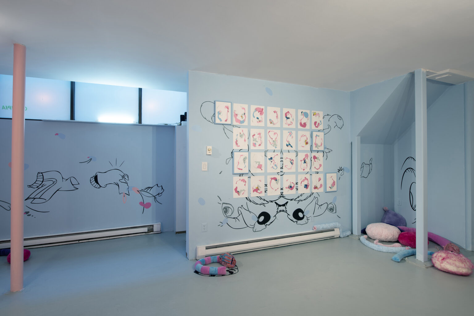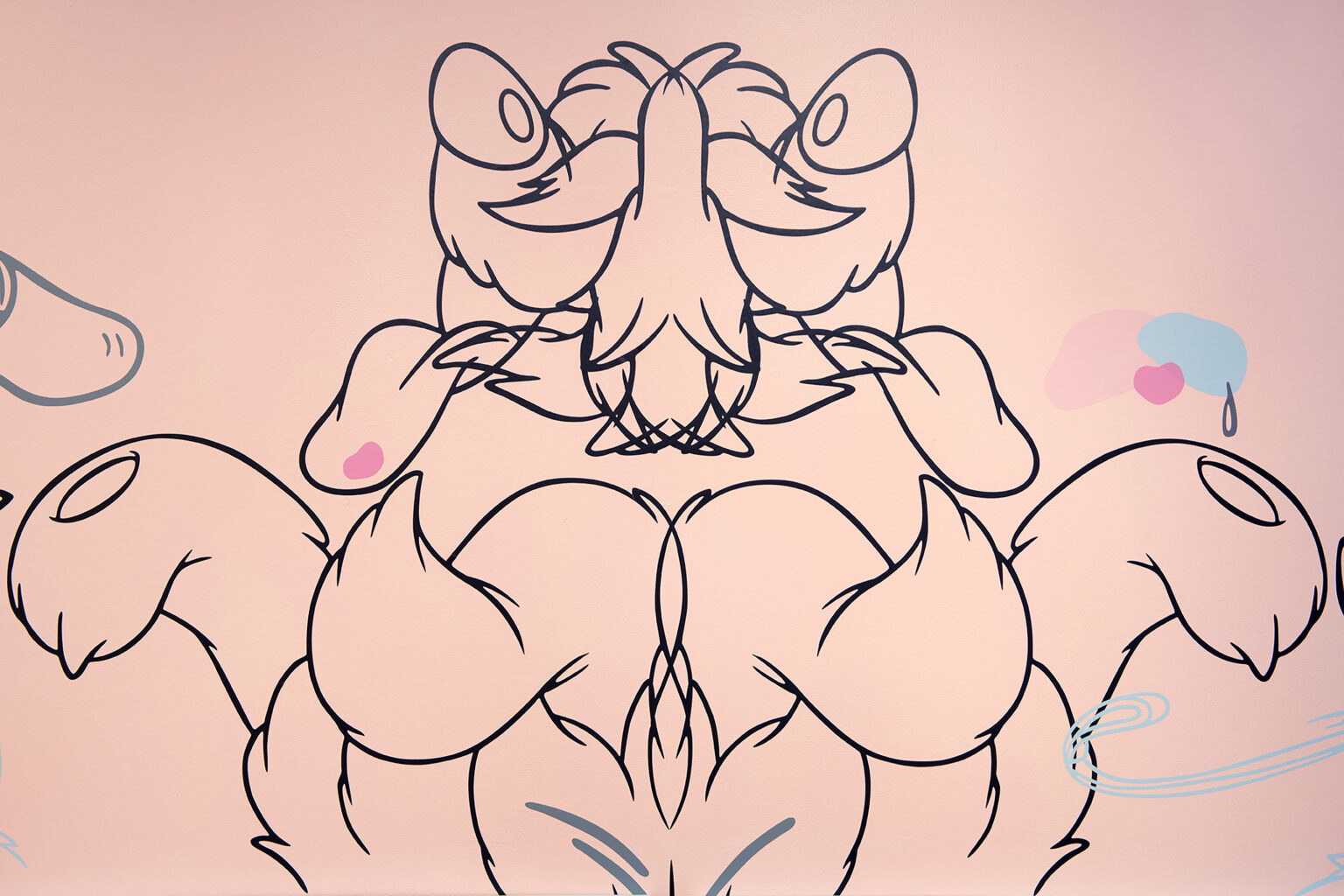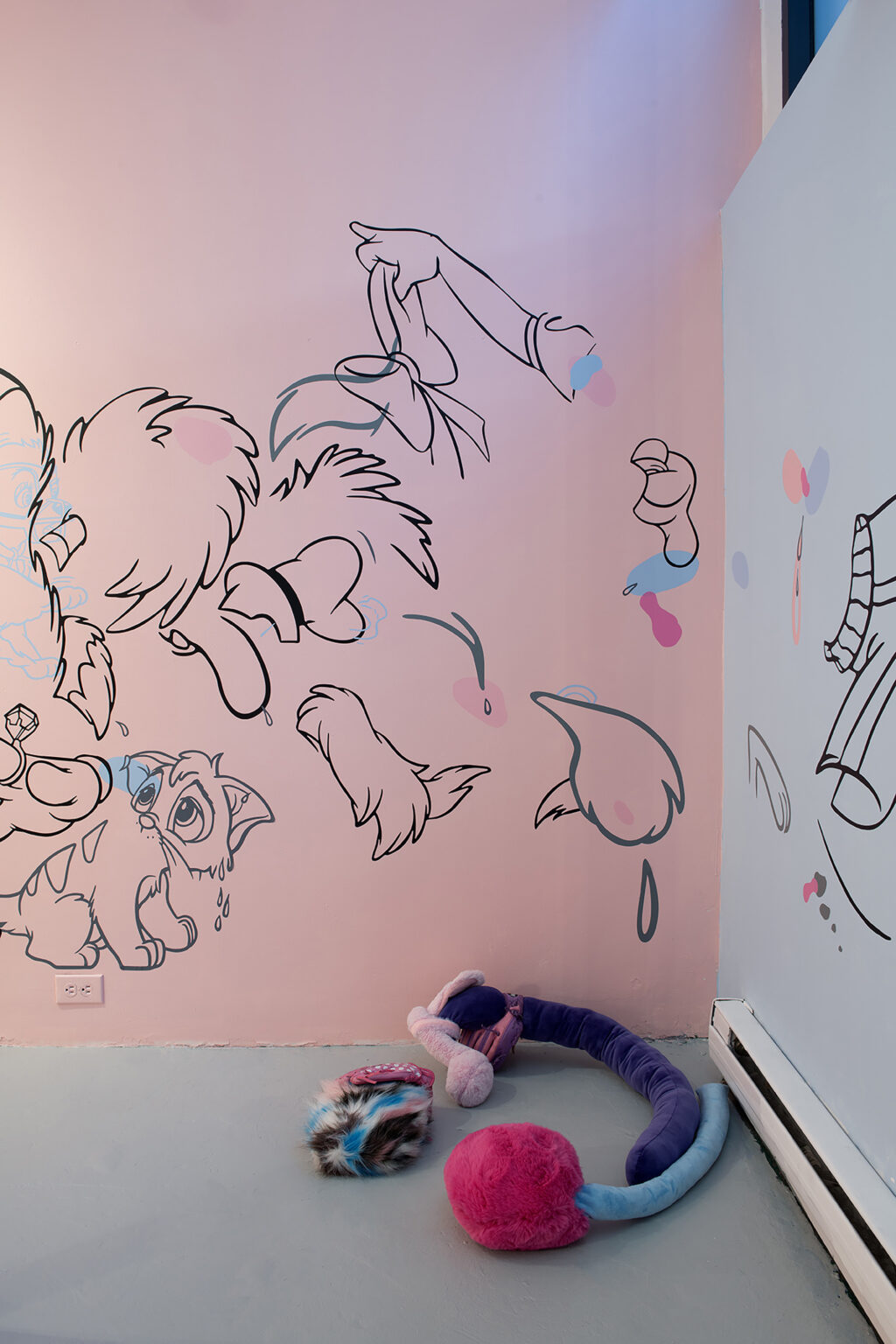 En Coloring Book , tres dípticos palindrómicos de personajes secundarios deconstruidos de Disney (Minnie, Clarabelle Cow y Figaro) junto a una única obra centrada en Goofy, anclan el mural con recortes de vinilo esparcidos por su superficie, cayendo en dos tonos superpuestos. Los vinilos utilizados en el mural están hechos de materiales reutilizados producidos originalmente en Argentina para una muestra inspirada en la instalación Once Upon A Time de Keith Haring en el baño del Centro LGBT de Manhattan. Pospuestos indefinidamente, los materiales encuentran nueva vida aquí: otra ruptura en el tiempo que produce algo más al otro lado. Un espejo como ruptura, un nuevo comienzo. Trozos de ropa y partes del cuerpo se convierten en gestos hacia algo más, repitiendo la iconografía familiar al mismo tiempo que socavan sus definiciones.