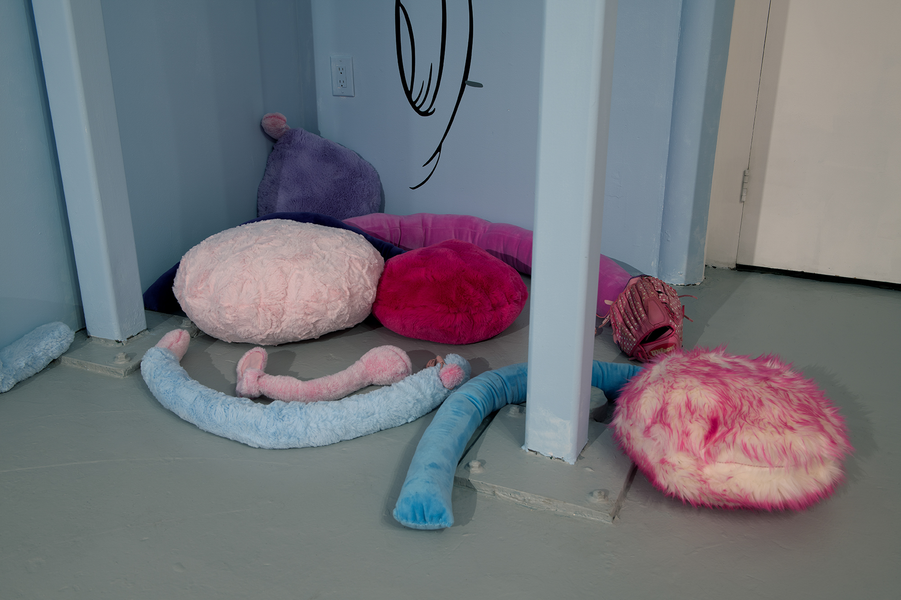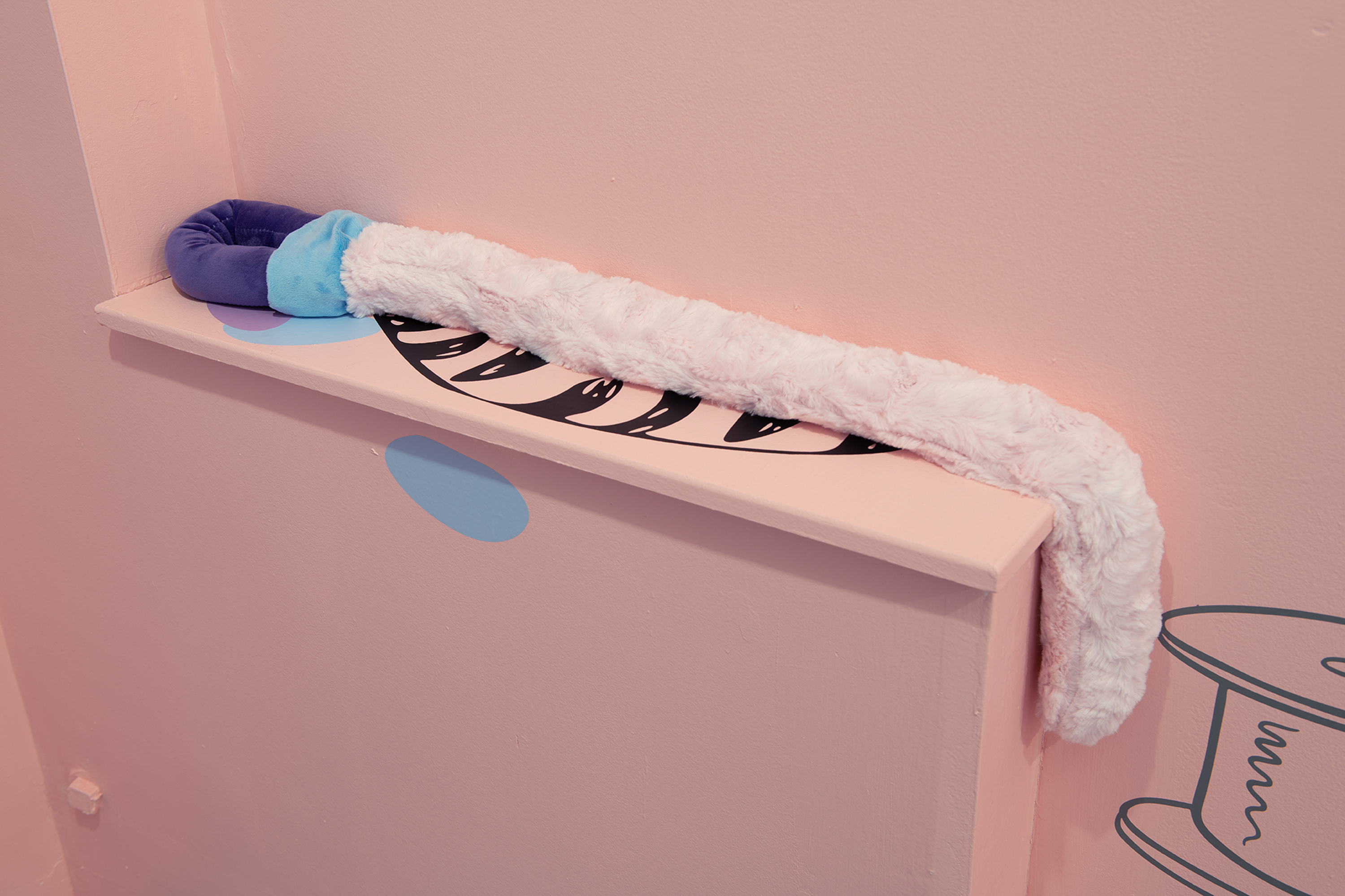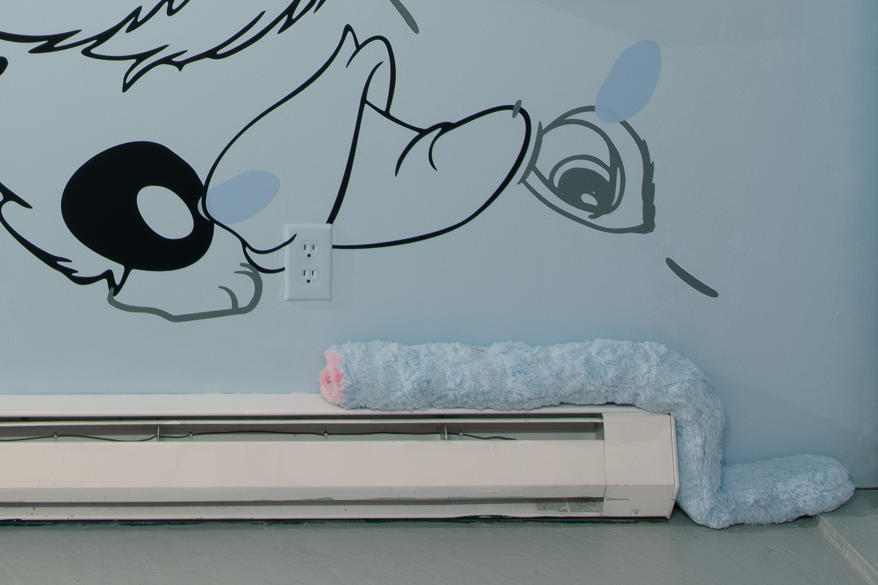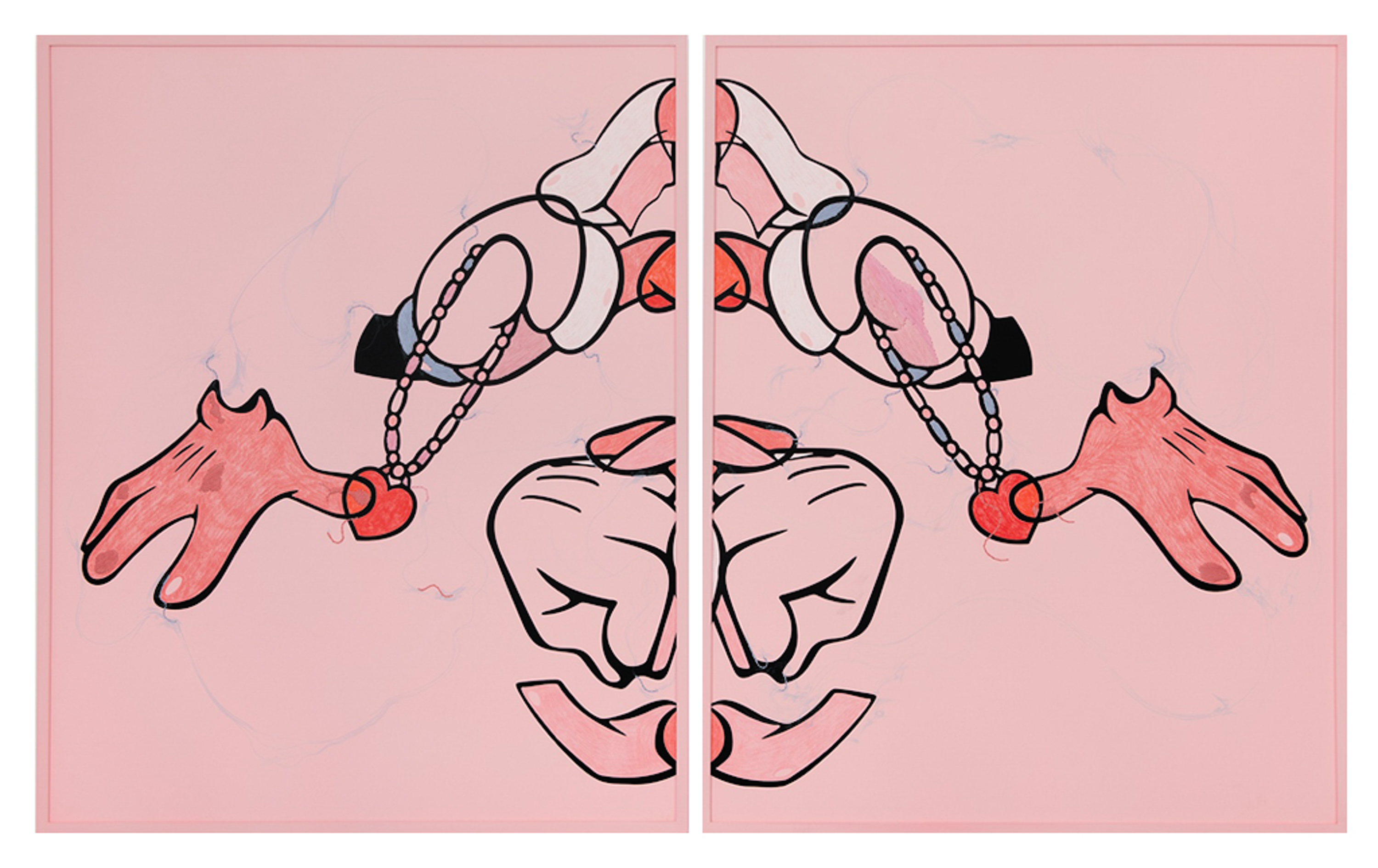 En Coloring Book , tres dípticos palindrómicos de personajes secundarios deconstruidos de Disney (Minnie, Clarabelle Cow y Figaro) junto a una única obra centrada en Goofy, anclan el mural con recortes de vinilo esparcidos por su superficie, cayendo en dos tonos superpuestos. Los vinilos utilizados en el mural están hechos de materiales reutilizados producidos originalmente en Argentina para una muestra inspirada en la instalación Once Upon A Time de Keith Haring en el baño del Centro LGBT de Manhattan. Pospuestos indefinidamente, los materiales encuentran nueva vida aquí: otra ruptura en el tiempo que produce algo más al otro lado. Un espejo como ruptura, un nuevo comienzo. Trozos de ropa y partes del cuerpo se convierten en gestos hacia algo más, repitiendo la iconografía familiar al mismo tiempo que socavan sus definiciones.